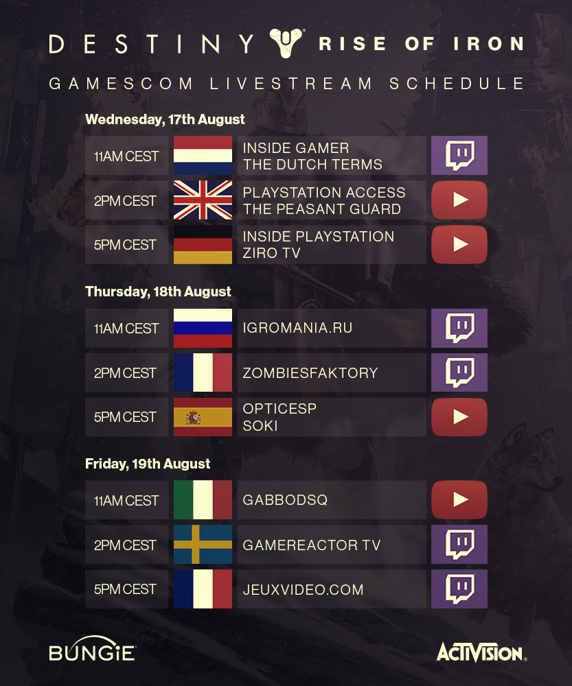 We’re getting ready to broadcast live from gamescom with more details about Rise of Iron. The show we’re putting on will last all week long. It will include many languages and many personalities from this community of Guardians who are eager for new action.