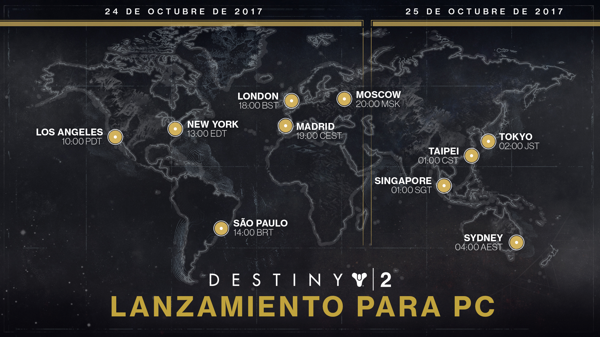 Para disfrutar de una experiencia óptima, se recomienda a los jugadores actualizar sus controladores a las versiones más recientes y aceptar todas las actualizaciones de Windows pendientes antes de acceder a Destiny 2 en PC.Además, como medida preliminar de resolución de problemas, los jugadores deberían cerrar y volver a iniciar el cliente de Destiny 2 y la aplicación de Blizzard. Para los jugadores que sigan encontrándose con estos problemas, se recomienda eliminar el archivo CVARS.xml existente.Este archivo se puede encontrar en:\Usuarios\NOMBRE DE USUARIO\Appdata\Roaming\Bungie\DestinyPC\prefs\.Al volver a iniciarse, la aplicación de Destiny 2 generará un nuevo archivo CVARS.xml.Los jugadores que se encuentren otros problemas distintos a los indicados deberán comunicarlos en el foro de Soporte para PC.Requisitos del sistema para PC y lanzamientoLa semana pasada anunciamos los requisitos del sistema definitivos de Destiny 2 para PC. En adelante, estos requisitos se anotarán en este artículo de Ayuda, para los jugadores.En cuanto al lanzamiento para PC, los jugadores deberán consultar el siguiente gráfico para ver cuándo estará disponible Destiny 2 en su zona geográfica. Los jugadores cuyas regiones no estén indicadas abajo deberán hacer clic aquí para conocer su hora local.![]()