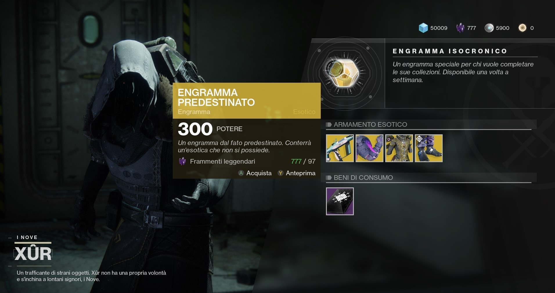 - Ogni settimana si potranno acquisire alcuni dei nuovi engrammi predestinati utilizzando i frammenti leggendari. Gli engrammi predestinati forniranno esotiche che non sono in vostro possesso.